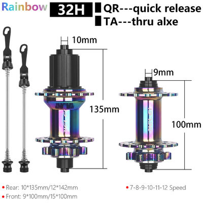 Brand:JIELEI Use:Mountain bike Braking System:Disc brake:Six-hole(QR/TA) Hub:Front two rear five Sealed bearing Color:Black/Purple/Rainbow/Pink Specification:Quick Release(QR):100x9 135x10mm Thru Axle(TA):100x15 142x12mm Freehub:Six claws and three teeth (120 rings) Number Of Spoke:32H Support speed:compatible for HG shimano 8-12 speed cassette flywheel optional HG/XD/MS Weight:Front:176g,Rear:370g;A pair:546g