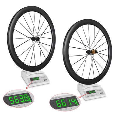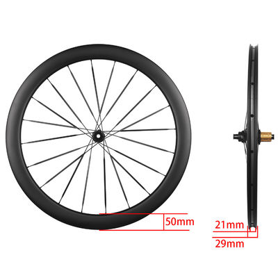 Brand:RUJIXU Product:50mm carbon fiber disc brake wheel set Materials:T800/700 carbon fiber Frame height:50mm Hub:36T ratchet Bearing:Sealed bearing Spoke:Taiwan produced carbon fiber spokes Holes:24 holes in front and back Rim:The inner width is 19mm and the outer width is 29mm Freehub:ADAPTS HG/XDR, supports 8-12 speed Gear opening:QR 100*9 135*9mm TA 100*12 142*12mm Brake system:Center lock disc brake (6-hole disc brake can be used with 6-hole transfer seat) Tire width range:700*23-45C Weight:1226g±%5