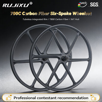 High-performance carbon fiber mountain bike wheel set featuring innovative six-spoke design for cross-country applications. Engineered for durability and optimized for tubeless tire compatibility with disc brake system.